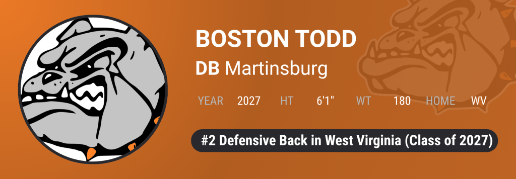 Martinsburg’s Boston Todd (6’0”, 180) is a top-tier athlete who excels on both sides of the ball. At safety, he showcases the same speed and range that make him dangerous on offense, allowing him to impact plays across the field.